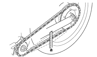 | CAUTION: A drive chain that is too tight will overload the engine and other vital parts, and one that is too loose can skip and damage the swingarm or cause an accident. Therefore, keep the drive chain slack within the specified limits. |