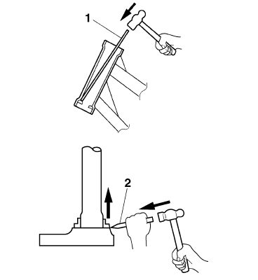 b. Remove the bearing race from the lower bracket with a floor chisel "2" and hammer.