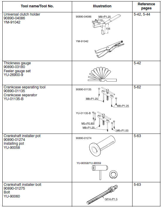 The following special tools are necessary for complete and accurate tune-up and assembly. Use only the appropriate special tools as this will help prevent damage caused by the use of inappropriate tools or improvised techniques. Special tools, part numbers or both may differ depending on the country.